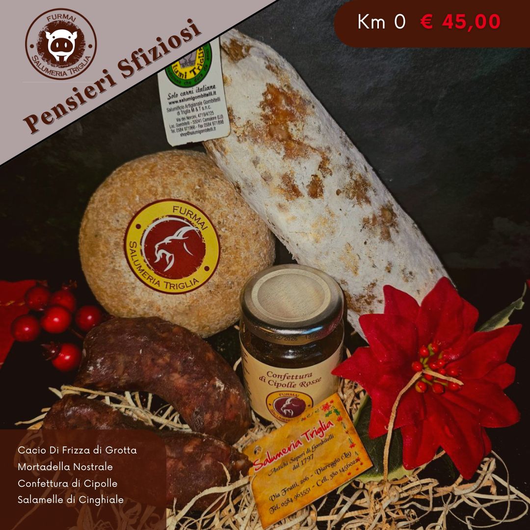 Il 9 luglio 2011 inizia il nostro percorso a Viareggio con l’inaugurazione della Salumeria Triglia, ma la nostra famiglia, produttrice di salumi sin dal 1797, fonda le sue radici nel piccolo borgo di Gombitelli un paesino medievale le cui tracce si possono trovare dal 984 d.c. La nostra passione per il pecorino va attribuita al Nonno Frizza, dedito alla pastorizia, grazie al quale venivano da molti paesi limitrofi per assaggiare i nostri salumi ed il nostro formaggio, che a Gombitelli come in molti posti della toscana viene chiamato “Cacio”. Ancora oggi potete assaporare sulla tavola quest’ antica ricetta risalente al 1920, il Cacio di Frizza, che viene prodotto in Garfagnana appositamente per la salumeria triglia di Viareggio dove insieme potrete trovare una selezione di oltre 50 tipi di salumi e oltre 80 tipi di formaggi che può anche incrementare in concomitanza con le festività o le vostre esigenze.